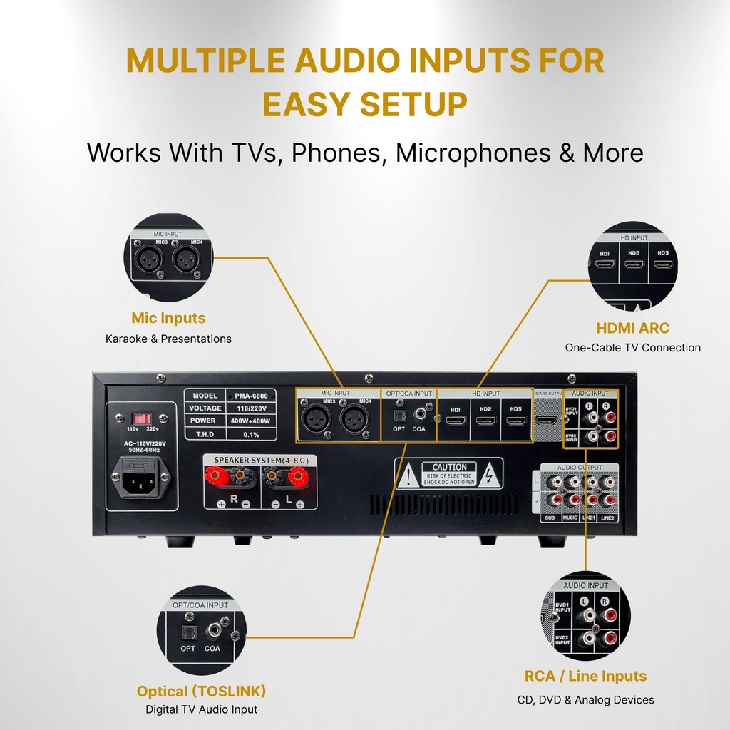 Enhanced Vocal Performance: The PMA-6800 is equipped with multiple microphone inputs, each with individual volume controls, and a digital echo effect. This setup is perfect for enhancing vocal performances, ensuring clarity and richness of sound. Whether for solo performances or group events, this feature provides the flexibility and quality needed for an impressive audio presentation.