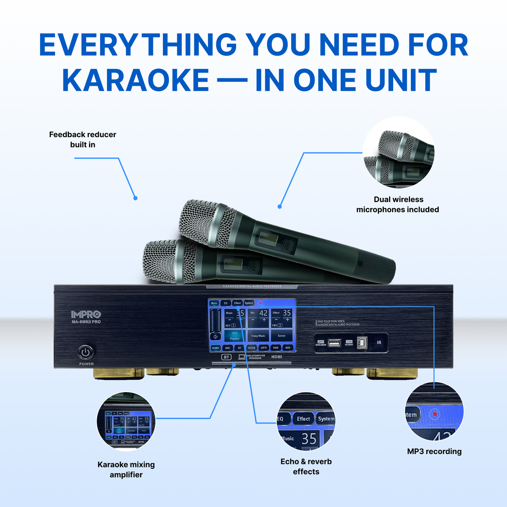 Offering a plethora of input options, from HDMI and RCA to Bluetooth and Optical, this amplifier accommodates every modern device. Whether you're belting classics from a DVD, streaming the latest hits via Bluetooth, or syncing with your TV through HDMI-ARC, the MA-8 Pro is your central hub for an unmatched karaoke experience.